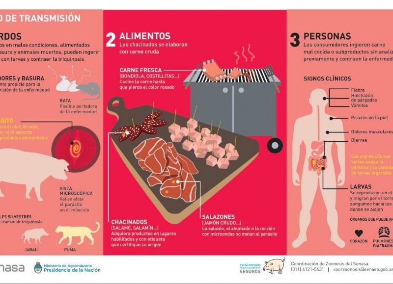 La triquinosis es una enfermedad producida por un parásito con forma de gusano que se encuentra alojado en los músculos de los cerdos, el jabalí y el puma. En caso de consumir carne de estos animales infectados, las personas se contagian de modo accidental por la ingestión de carne o derivados cárnicos, crudos o mal cocidos, que contengan larvas del parásito vivas.