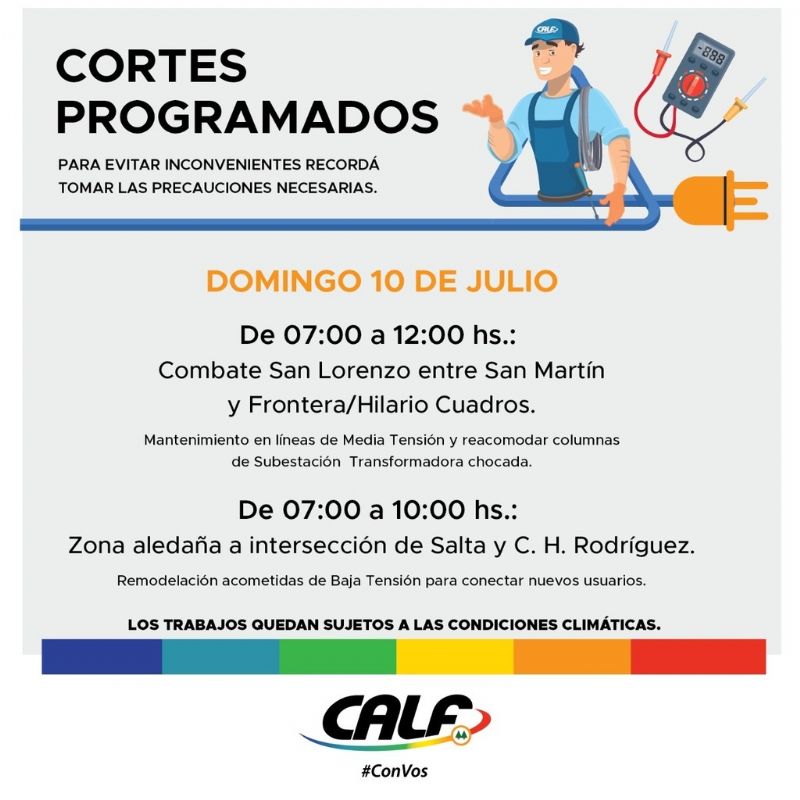 El domingo el corte del suministro eléctrico se realizará en el sector de Combate de San Lorenzo entre San Martín y Frontera por mantenimiento y remodelación por baja tensión de 7 a 12 horas. En tanto que de 7 a 10 en el sector de Salta y C. H Rodríguez corte por remodelación y conexión de nuevos usurarios. Los trabajos quedan sujetos a las condiciones climáticas.