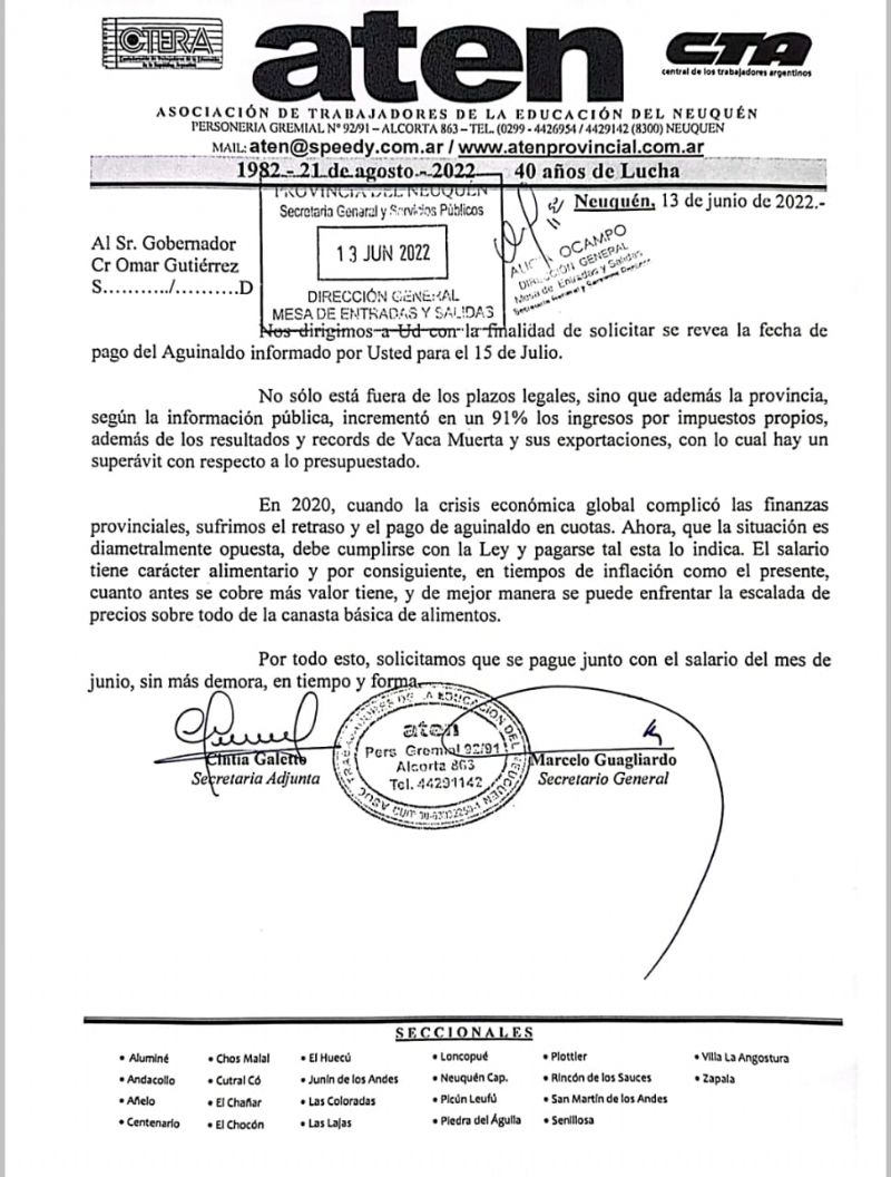 Mediante un comunicado de prensa de ATEN se informó que se ha presentado formalmente ante el Gobernador el reclamo por el adelantamiento de la fecha de pago del medio aguinaldo correspondiente al presente mes.