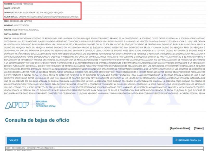En suma, Sánchez cuenta con esa sola actividad, ya que la AFIP en su momento lo dio de baja en el 2017 por no pagar las cargas patronales ni presentar las declaraciones juradas. Luego, la Administración le hace dos juicios por evasión impositiva en el Juzgado Federal de General Roca.