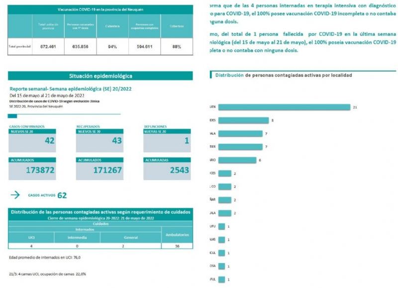 En el período informado, 13 fueron los casos nuevos que se registraron en la ciudad de Neuquén; 4 en San Martín de los Andes; 4 en Villa La Angostura; otros 3 en Vista Alegre; 2 en Centenario; 2 en Las Lajas; 2 en Zapala y 2 en Centenario; y un contagio en las localidades de Cutral Co, San Patricio del Chañar y Loncopué. Los muertos eran oriundos de Neuquén y Centenario.