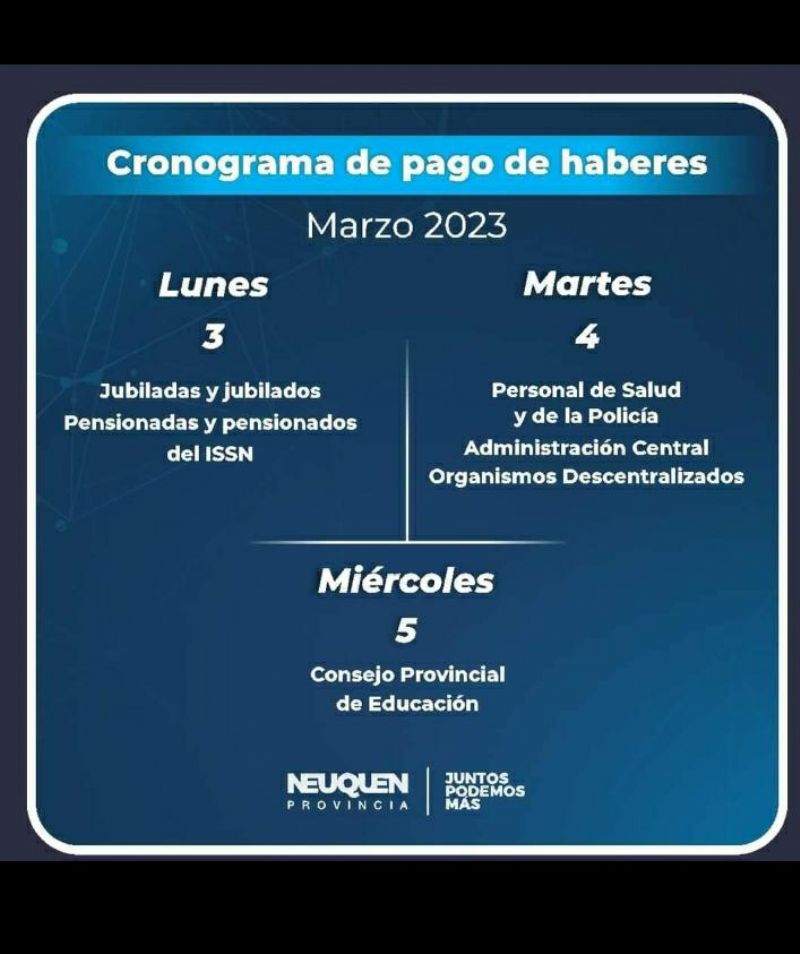 Ese día cobrarán los jubilados y pensionados del ISSN. El cronograma continuará el martes y culminará el miércoles. Este lunes se iniciará el cronograma de pago de los haberes de marzo a la administración pública provincial. Ese día se abonará a jubilados y pensionados del Instituto de Seguridad Social del Neuquén (ISSN).