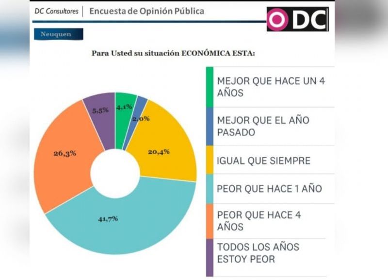 Según el estudio, un 41,7 por ciento de los encuestados asegura que económicamente esta "peor" que hace un año y un 26,3 por ciento dice que está peor que hace 4, lo que permite sostener que casi 7 de cada 10 neuquinos considera que está económicamente "peor" que en el pasado inmediato. Incluso se registra un segmento de extremo pesimismo que dice que "todos los años estoy peor".