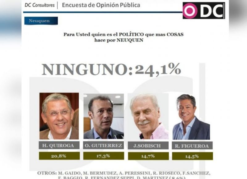 En ese sentido, el fallecido Horacio "Pechi" Quiroga, se erige como el dirigente "que más cosas hace por Neuquén", siendo elegido por el 20,8 por ciento de la población, dejando a Gutiérrez en segundo lugar, con un 17,3 por ciento.
