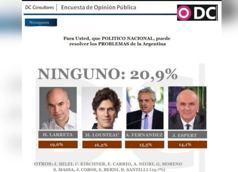 En ese escenario la opinión mayoritaria, con el 20,9 por ciento indica que "ningún" político de proyección nacional podría resolver los problemas de Argentina, aunque el 19,6 por ciento cree que la mejor opción es el jefe de Gobierno porteño, Horacio Rodríguez Larreta, seguido de Martín Lousteau con el 16,2 por ciento y sorpresivamente aparece Alberto Fernández en tercer lugar con el 15,5 por ciento.